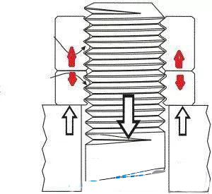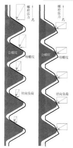 普通螺纹———60°角V形螺纹在其第一螺纹啮合面和第二螺纹啮合面承载了70%~80%的负荷,而以后几个啮合面承受的负荷很少。这样一来普通螺纹紧固件在工作振动负荷条件下,就很容易克服螺纹接触面上的锁紧力而产生转动,进而松脱,这就是普通螺纹紧固件松脱的原因所在。
