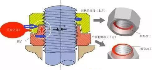 Hard lock 防松小猪视频成人软件下载是有上下呈“凹”“凸”形状的两种小猪视频成人软件下载组合成的。下方呈凸状的小猪视频成人软件下载,在加工时中心稍许错动(偏心加工),起到楔子的作用。上方呈凹状的小猪视频成人软件下载,则不作偏离中心的加工(圆形加工),于是形成了锤子揳打楔子的功能,上下小猪视频成人软件下载的“凸”面和“凹”面都是锥形面,这样即使很小的轴向压力,也可以产生很大的径向压力。“凸”“凹”锥面间的压力会传递到上下小猪视频成人软件下载的咬合螺纹上,螺纹咬合面间和凸凹锥面上都会产生很大的摩擦阻力距,这样起到防松的作用。