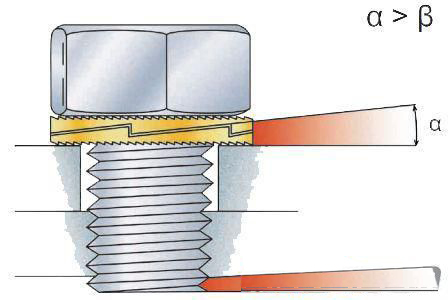 这种垫圈的一面是大斜齿面,在垫圈的另一面有放射状锯齿。NORD-LOCK垫圈是大齿面相对,成对安装的。当拧紧螺栓或小猪视频成人软件下载时,放射状锯齿紧紧咬住接触面,使NORD-LOCK垫圈分别与小猪视频成人软件下载和连接件接触面相对固定,只允许大斜齿面间的相对移动。螺栓或小猪视频成人软件下载的任何松动趋势都被大锯齿的这种楔入效果所阻止。两片NORD-LOCK垫圈之间的抬升距离大于因螺纹滑动引起的螺栓或小猪视频成人软件下载抬升的距离。